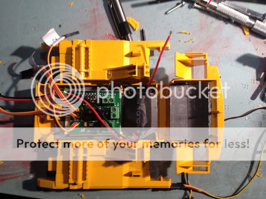 http://i240.photobucket.com/albums/f...4.jpg~original[/QUOTE] quoted for INFO below here, NOT for images Since I had to order more parts, I have a more accurate list: Radio system Tamiya twin motor gearbox shims for tamiya gearbox assembly (you loose about 10 to 20% of gear contact on some of them if you leave them sloppy) silicone to seal gearbox up (makes it last a very long time) 2 x slotcar motors (tamiya motors are 3.5 volts and fry quickly) Aluminum stock to make drive hubs 4-40 screws & washers to secure gearbox to chassis Saber tooth motor controller 5 volt 5 amp (continuous) bec Hitec Digital HS-7955 TG lift servo 2 x hitec hs-5065mg digital servos for bucket curl Hitec servo programmer 3" Y harness to join the 2 bucket curl servos 2 x 12" male servo leads to extend the bucket curl servos heat shrink for all of the bucket curl servo wiring piece of bicycle inner tube for lift lever cover (need to post pics) 4-40 rod and clevis for lift lever lead weight and 1 boat load of patience |