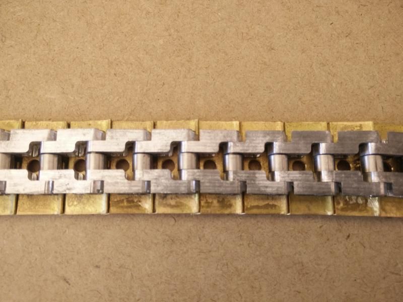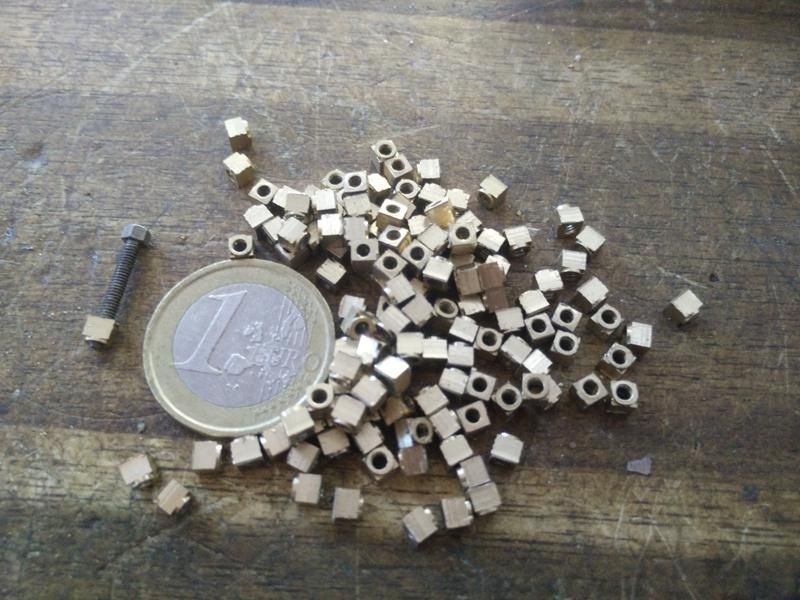 Well, these are the most important pieces, now it make a dotted and drill (which has no mystery), one thing that if it could be funny / curious, are the nuts with hex screws that hold the pads to the chain, finally i did it with my cnc router, the pieces were made in brass, nuts are threaded to M2 and measure 3x3mm, totaling 405 nuts, machined with a 1.5mm drill (the champion of end mills)